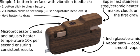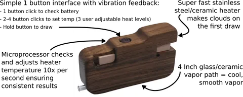 The Firewood 5 improved on its predecessor with an optimized air path and more consistent vapor production. It retained the wooden casing and the 18650 battery, but solved some criticisms of the Firewood 4. Heating method: convection. Maximum temperature 215°C.2000mAh battery. Heating time approx. 8 seconds. Compatible with water pipe adapter.2 year(s) warranty.