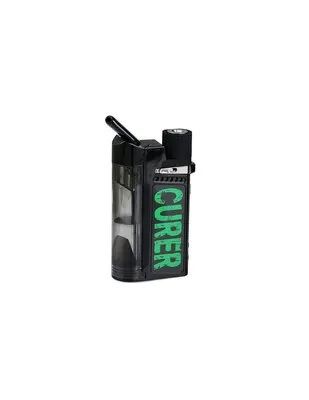 Der Curer liegt gut in der Hand und passt in jede Jackentasche. Die Bedienung erfolgt über einen oder mehrere Buttons. Das Gerät heizt die Kräuter in einer Keramik- oder Edelstahlkammer durch direkten Wandkontakt auf. Typische Aufheizzeit: 20-40 Sekunden bis zur Betriebstemperatur.