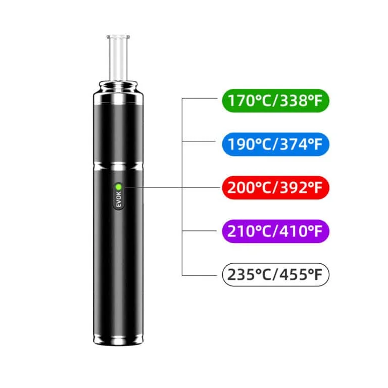 De Evok biedt präzise Temperatursteuerung mit digitalem Display. Bij conductie-vaporizers is temperatuurkeuze belangrijk: laag (180-190°C) voor smaak, midden (190-210°C) voor balans, hoog (210-230°C) voor dikke wolken.